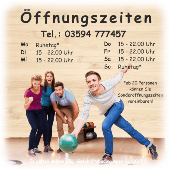 Unsere Öffnungszeiten richten sich nach den bestehenden Reservierungen der Bowlinganlage! Bitte unbedingt vorreservieren.
